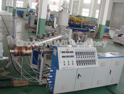 A linha de produção projeto das tubulações da proteção do cabo do HDPE pela empresa da maquinaria de Huasu inclui principalmente a extrusora de único parafuso, morre, tanque refrigerar de água do vácuo, máquina do transporte-fora, máquina de enrolamento e máquina de corte de calibragem.