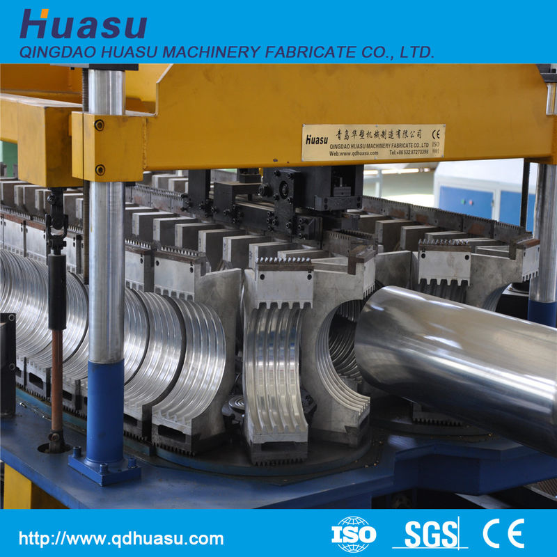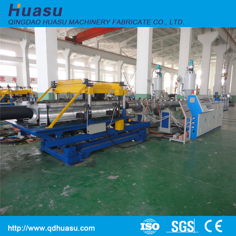 Extrusora: A extrusora de único parafuso da alta velocidade e da eficiência é projetada especialmente para expulsar material do PE. Tambor sulcado, equipado com o fã mais baixo do ruído, a alta velocidade e o redutor duro da engrenagem. As camadas internas e exteriores da tubulação ondulada são alimentadas independentemente o material por duas extrusora. Pode fazer o interno e as camadas exteriores produzem a extrusão diferente da eficiência elevada do material e da garantia.