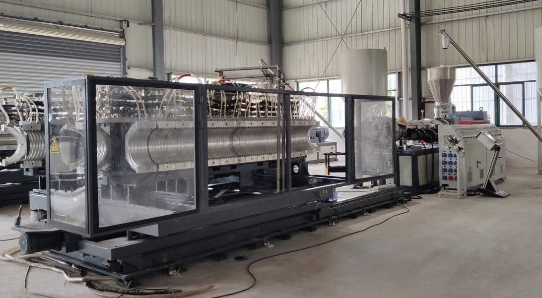 Extrusora: A extrusora de único parafuso da alta velocidade e da eficiência é projetada especialmente para expulsar material do PE. Tambor sulcado, equipado com o fã mais baixo do ruído, a alta velocidade e o redutor duro da engrenagem. As camadas internas e exteriores da tubulação ondulada são alimentadas independentemente o material por duas extrusora. Pode fazer o interno e as camadas exteriores produzem a extrusão diferente da eficiência elevada do material e da garantia.