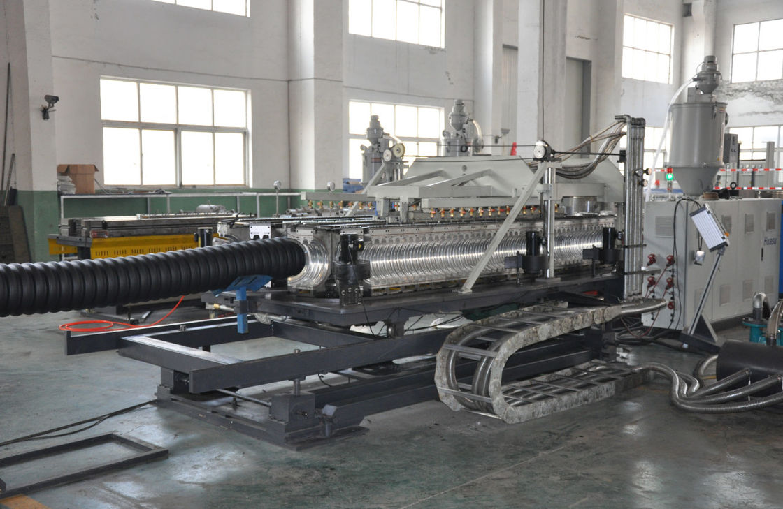 A cabeça da máquina moldando tem a elevada precisão e a boa permutabilidade do módulo. O método refrigerando do módulo inclui refrigerar de água e refrigerar de ar. Pode realizar em linha o alargamento e assegurar vários índices do desempenho da tubulação de formação. A máquina de corte circular da dobro-faca tem a precisão de corte excelente. O equipamento inteiro adota o sistema de controlo da seção da humano-máquina de Siemens, que tem a função alta do autocontrole. Pode produzir a tubulação ondulada de dupla parede do PE substituindo a extrusora e as peças relacionadas.