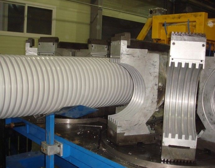 A máquina moldando adota a estrutura fechado completa horizontal, que é fácil de operar e elegante na aparência. Através do módulo da transmissão da engrenagem, o molde é refrigerado pela água, os produtos são refrigerados pelo ar, e a trilha moldando é longa, de modo que a tubulação ondulada produzida tenha a velocidade moldando rápida, forma ondulada uniforme, emendas consistentes e as paredes internas e exteriores lisas alisam, qualidade estável, e podem manter a operação de alta velocidade.