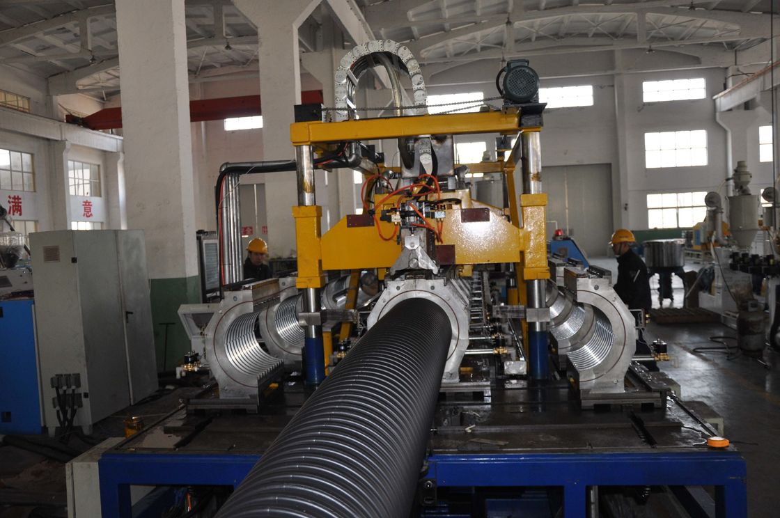 O → de alimentação de mistura do secador do funil do → da máquina do vácuo do → do → da matéria prima + do aditivo extrusora de único parafuso para o material de PE/PP/extrusora de parafuso dobro para a extrusão da tubulação do material→ do PVC morre + tubulação ondulada que forma o die→ que forma o transporte do machine→ fora da máquina de corte do → da máquina