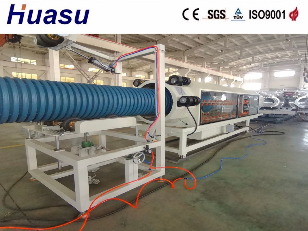 A linha de tubo de parede duplaé a terceira geração do produto aprimorado de Shandong Huasu. A saída da extrusora e a velocidade de produção do tubo aumentam bastante 20-40% em comparação com o produto anterior.